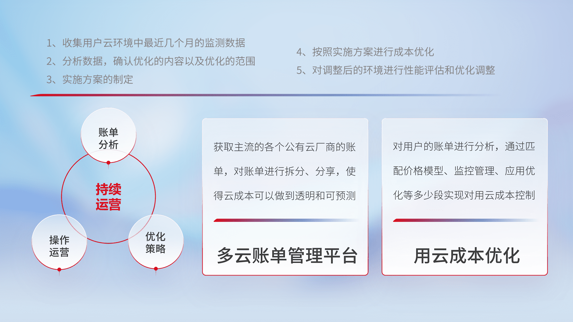 通过多云纳管,,,,以统一的资源数据模型把客户的云资源进行抽象和封装,,,,进而实现对多云资源的统一操作,,保障云资源管理的可靠性、、、稳定性与可用性。。量身定制化运维内容,,,,配置、、、开发运维、、、补丁管理、、、备份、、、、监控、、认证和访问管理、、、审计和日常巡检等,,,,保障在用云过程中的可靠度,,稳定度以及高可用率。。